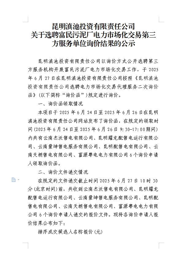 昆明滇池投資有限責(zé)任公司關(guān)于選聘富民污泥廠電力市場化交易第三方服務(wù)單位詢價結(jié)果的公示