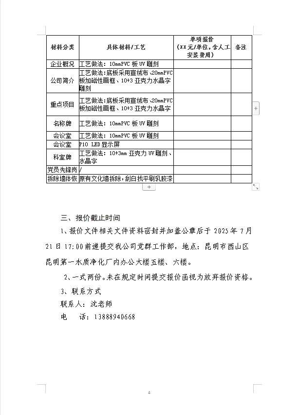 首頁>信息公開>昆明羅泊河水庫建設(shè)管理有限責(zé)任公司黨支部規(guī)范化陣地建設(shè)提升改造服務(wù)詢價(jià)函