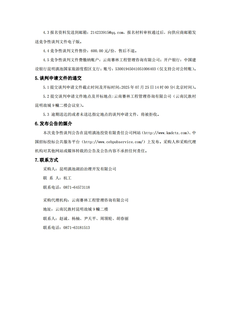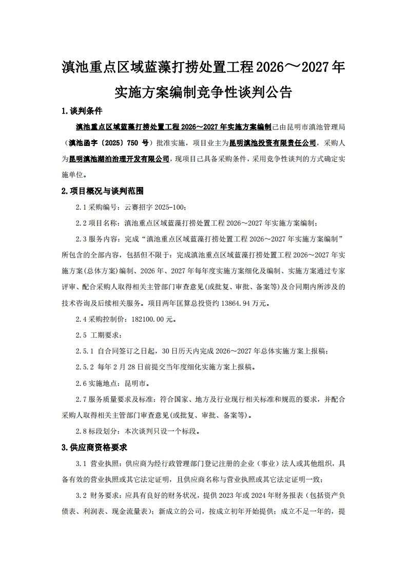 滇池重點區(qū)域藍藻打撈處置工程2026~2027年實施方案編制競爭性談判公告