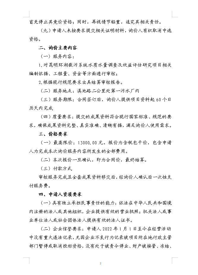 昆明滇池投資有限責(zé)任公司選聘昆明環(huán)湖截污系統(tǒng)水質(zhì)水量調(diào)查及效益評(píng)估研究項(xiàng)目選聘審核單位詢價(jià)函