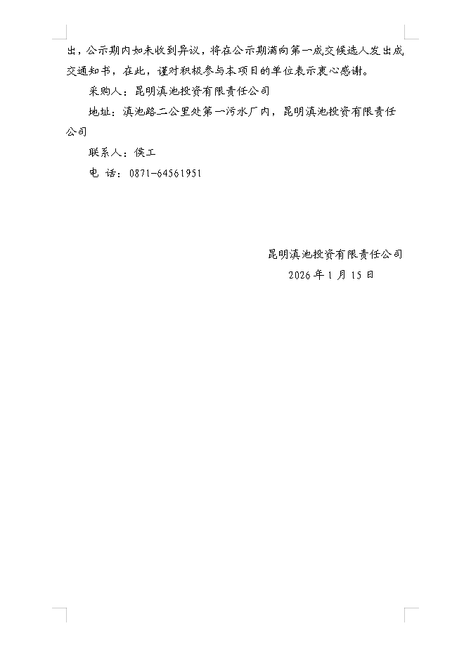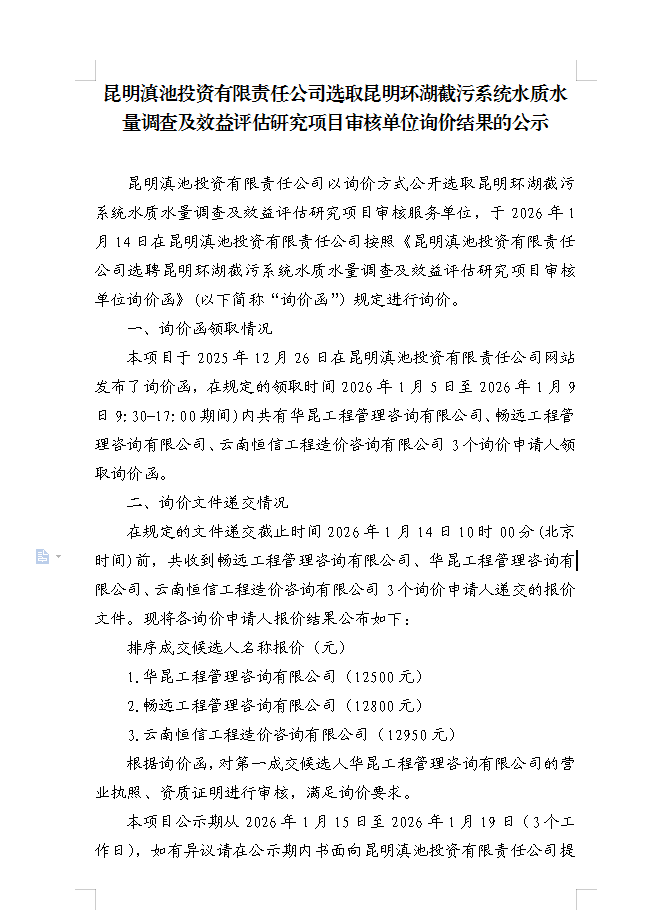 昆明滇池投資有限責任公司選取昆明環(huán)湖截污系統(tǒng)水質(zhì)水量調(diào)查及效益評估研究項目審核單位詢價結(jié)果的公示